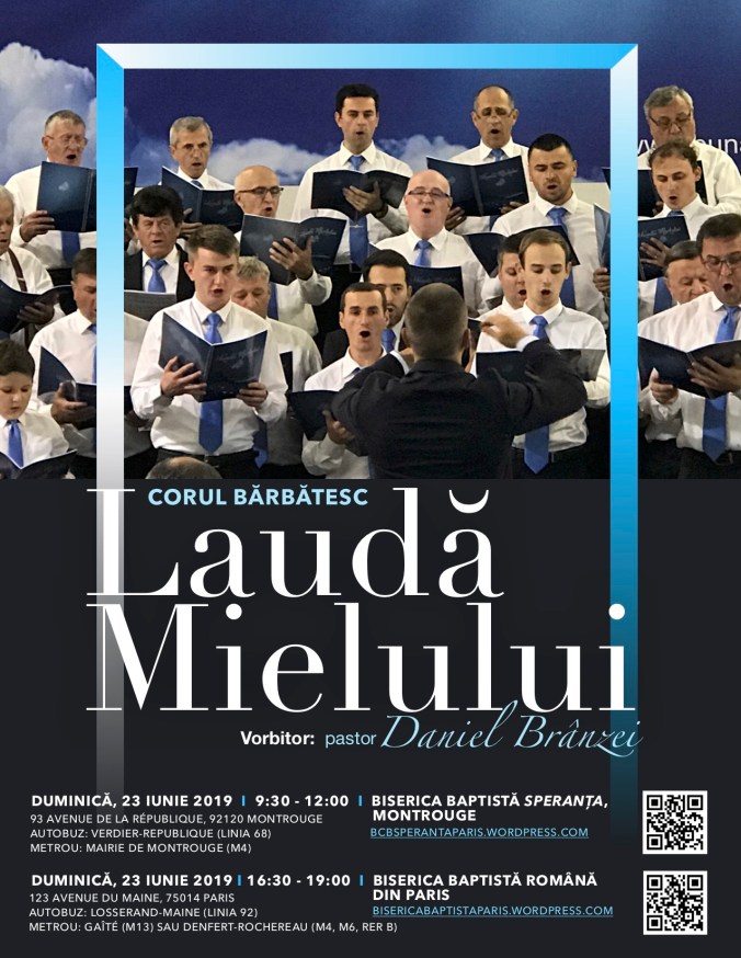 Corul bărbătesc „Laudă Mielului”, format din membri ai bisericilor baptiste din Statele Unite ale Americii, va cânta spre slava Domnului, iar mesajul Evangheliei va fi vestit de fratele Daniel Brânzei, pastor la Biserica Baptistă „Betel” din Anaheim – California.