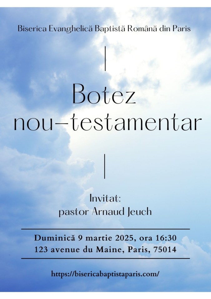 Duminică, 9 martie 2025, începând cu ora 16:30, vă invităm să luați parte cu noi la un botez nou-testamentar.